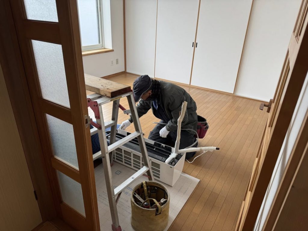 エアコンの 取付作業を 職人さん